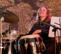 The concert features Gina Benalcázar on trombone, Jhoely Garay on guitar, Emiko Hayashi on piano, Lauren Hendrix on bass, Kaori Yamada on drums, Annette Aguilar as the rhythm section, and vocals by Audra Bowers and Louise Rogers.